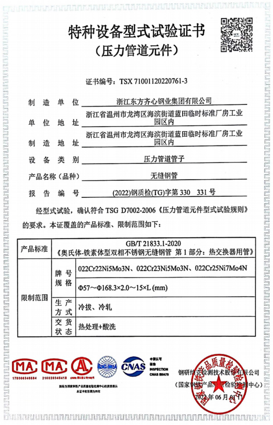 浙江東方齊心以不銹鋼系列產(chǎn)品為主導(dǎo),品種有不銹鋼管、奧氏體不銹鋼管、高溫合金鋼管、雙相不銹鋼管、鎳基合金管、冷凝器用管、U形管、核電管、不銹鋼管件、法蘭、閥門等。規(guī)格有6-2020x0.8-60mm,Ф16-25長度可達33m。公司擁有精密制造鋼管的各類機械設(shè)備25臺(套),其中各類冷軋管機15臺, 冷拔機10臺,天然氣熱處理爐2套。